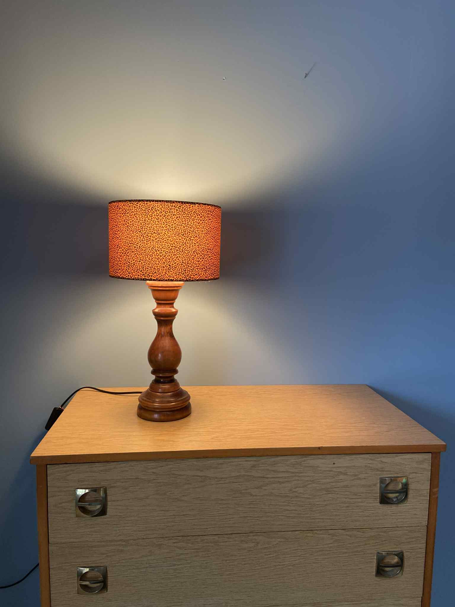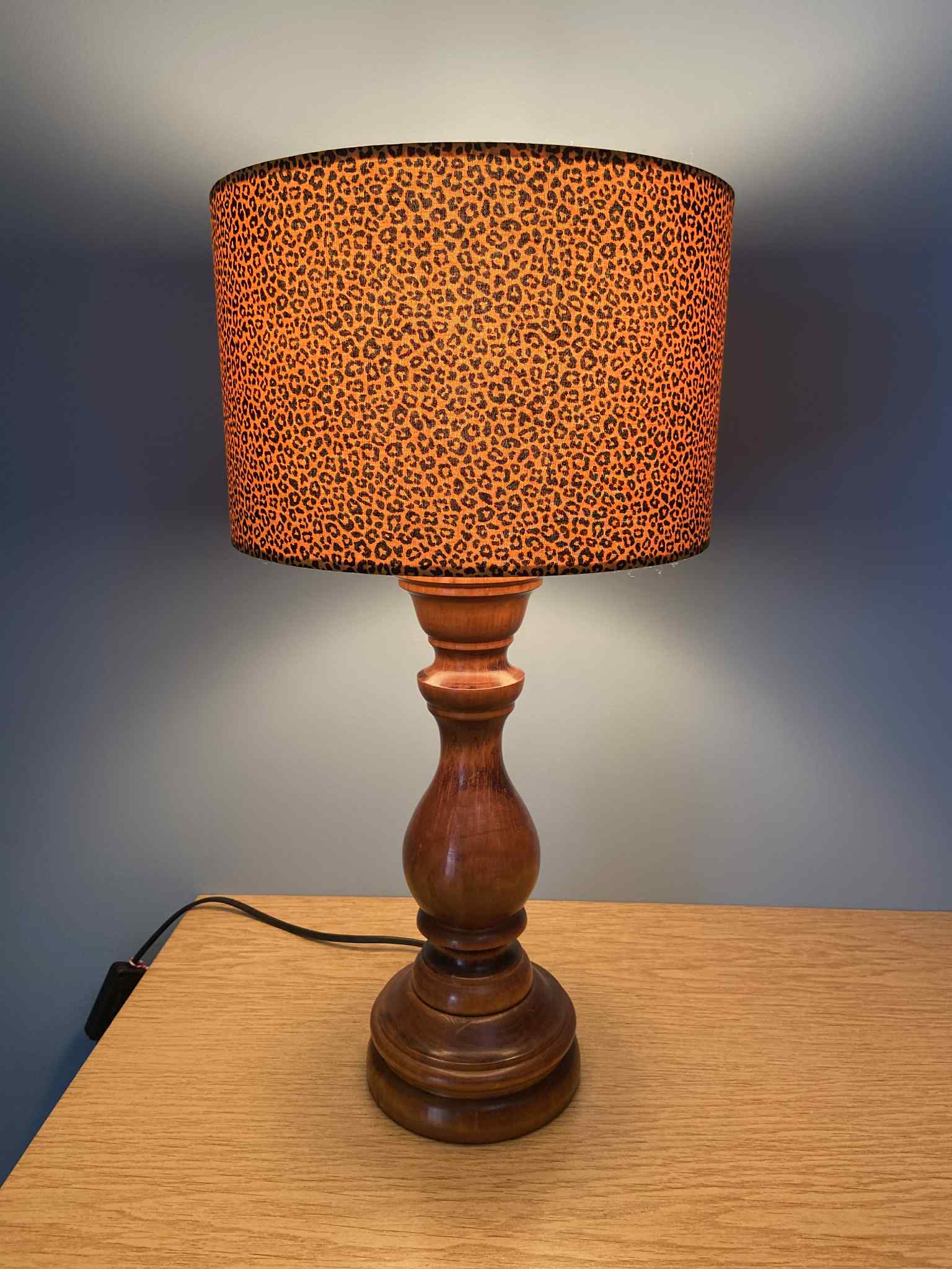Grande lampe création pied en bois tourné laissé brut car belle patine. Abat-jour réalisé à partir d'un tissus léopard neuf. Luminosité douce et diffuse.