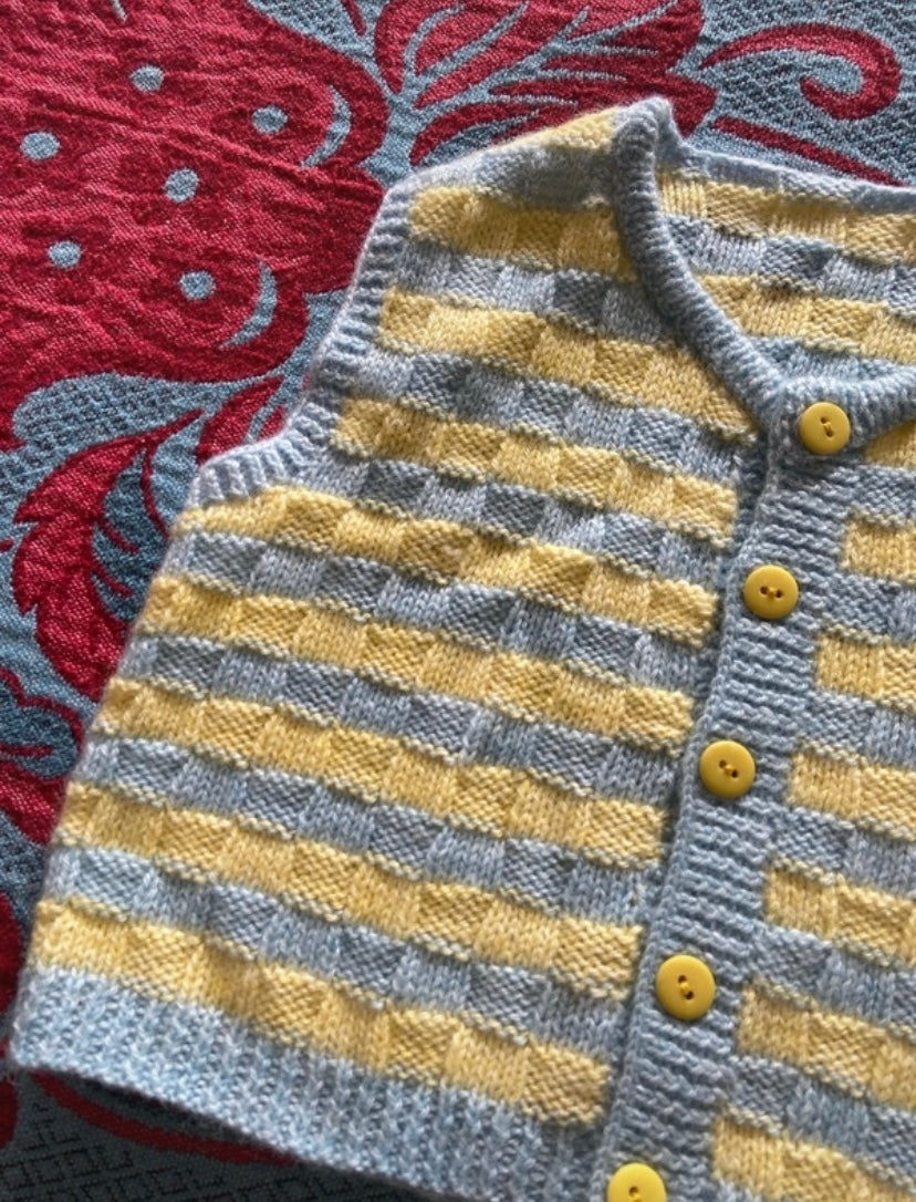Gilet sans manches vintage rayures bleu ciel et jaune