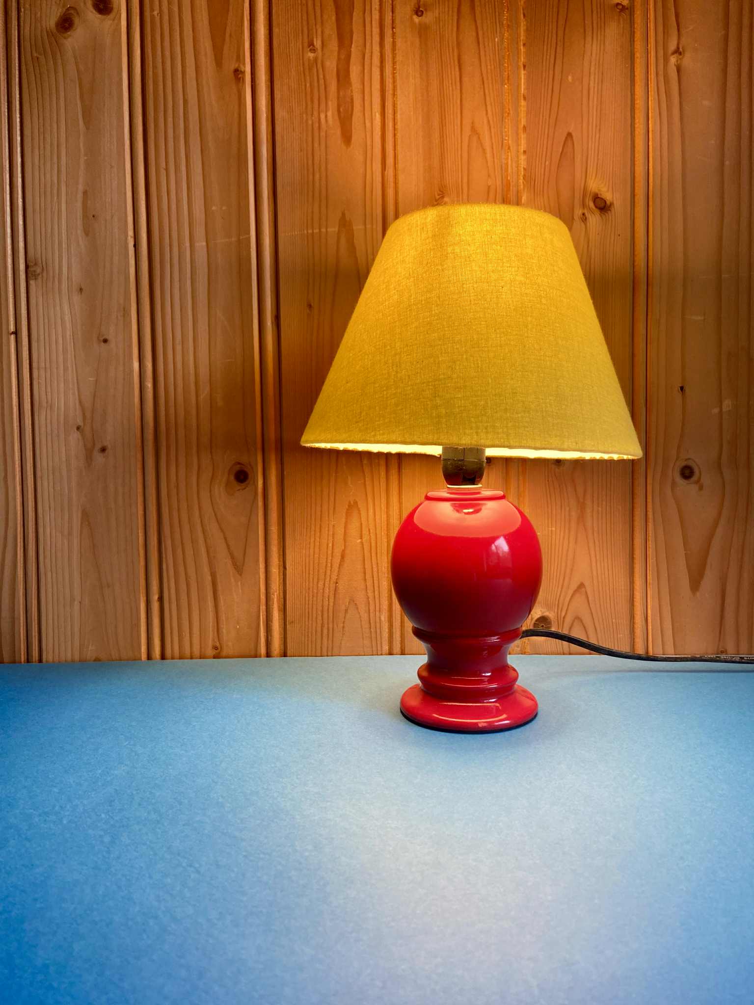 Lampe pied céramique rouge avec abat-jour vintage chiné jaune.